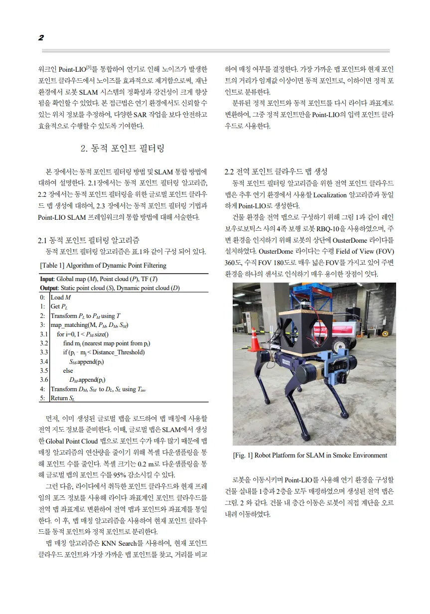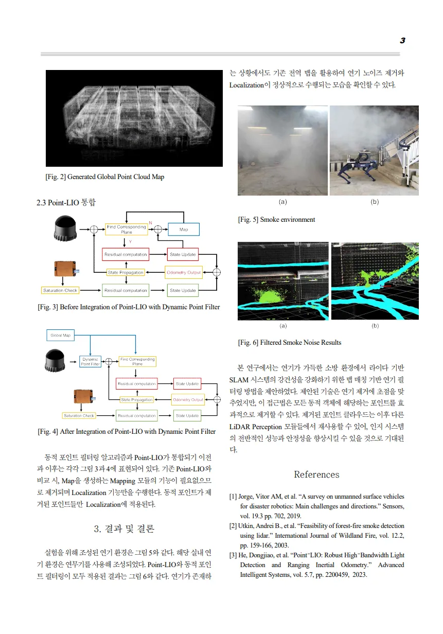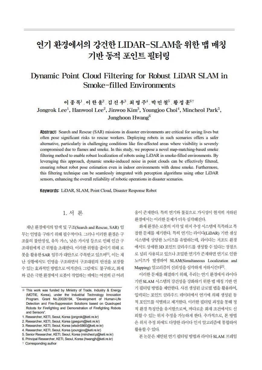 이종록, 이한울, 김진우, 최영주, 박민철, 황정훈. "연기 환경에서의 강건한 LIDAR-SLAM을 위한 맵 매칭 기반 동적 포인트 필터링." 제20회 한국로봇종합학술대회 논문집 (2025).