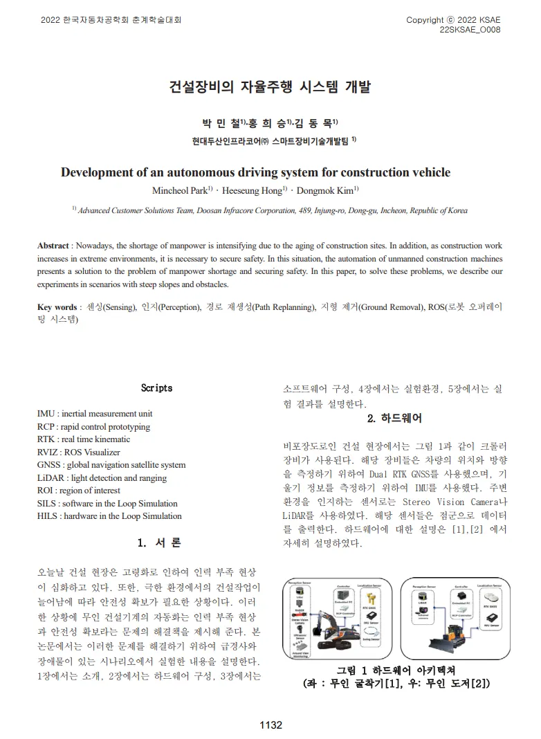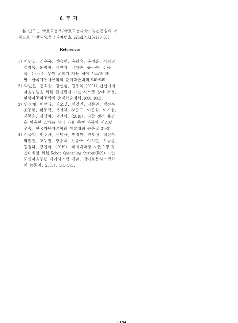 박민철, 홍희승, 김동목. (2022-06-02). 건설장비의 자율주행 시스템 개발. 한국자동차공학회 춘계학술대회, 부산.