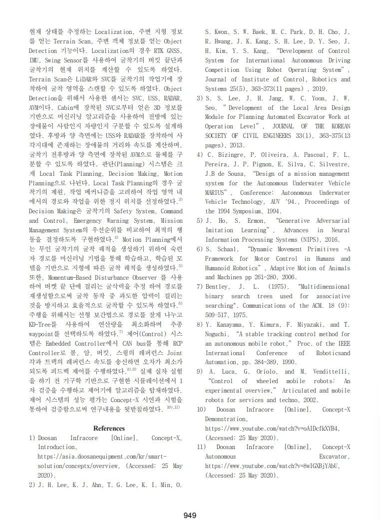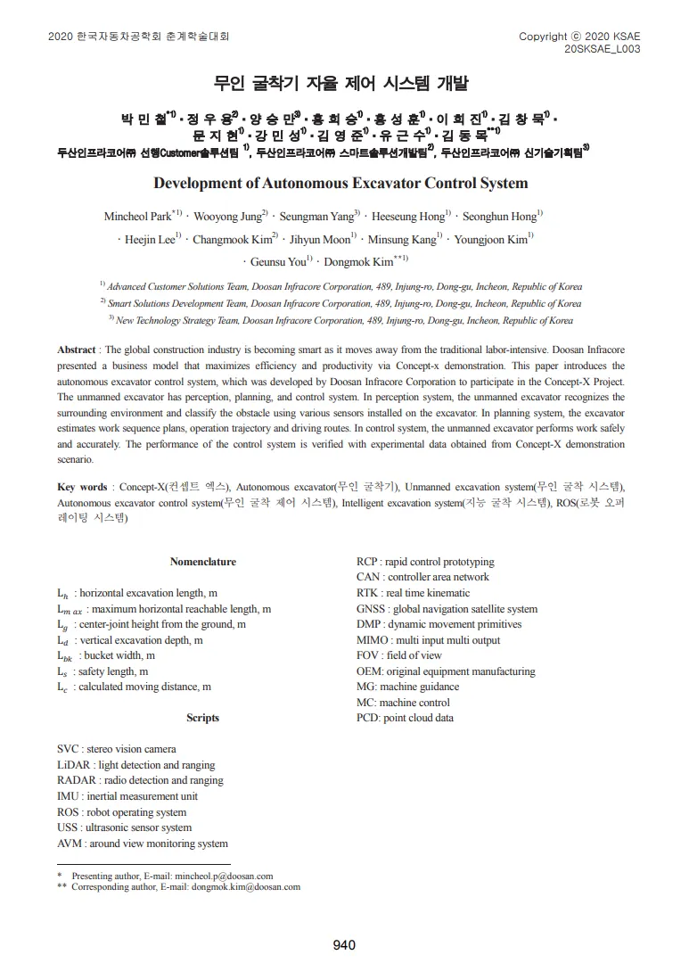 박민철, 정우용, 양승만, 홍희승, 홍성훈, 이희진, 김창묵, 문지현, 강민성, 김영준, 유근수, 김동목. (2020-07-01). 무인 굴착기 자율 제어 시스템 개발. 한국자동차공학회 춘계학술대회, 강원.